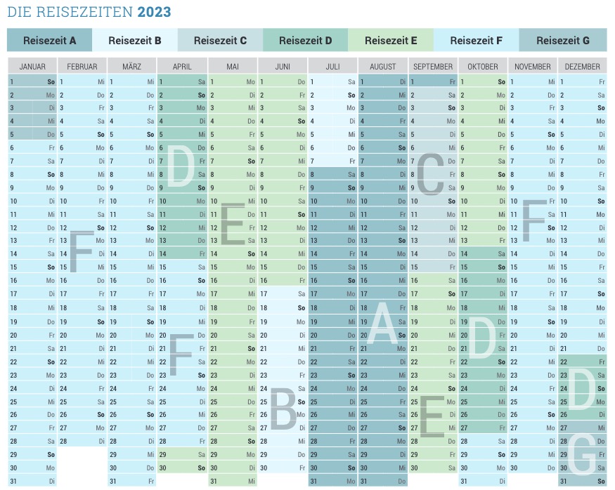 Reisezeit A : 80,00 € Reisezeit B : 75,00 € Reisezeit C : 75,00 € Reisezeit D : 65,00 € Reisezeit E : 65,00 € Reisezeit F : 55,00 € Reisezeit G : 60,00 €